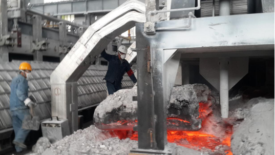 待多功能天車(chē)將殘極調(diào)出,趙德福高溫下的"高溫作業(yè)"才算正式開(kāi)始。因?yàn)闅垬O調(diào)出后裸露出火紅的、溫度高達(dá)900多攝氏度的爐膛。趙德福用大勾、大耙等工具將大小不一的殘極塊一一撈出,確認(rèn)爐膛干凈后,指揮多功能天車(chē)裝入新陽(yáng)極,張壽昌、劉強(qiáng)負(fù)責(zé)添加保溫料、殼面整形等。