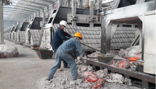圖為:工投公司電解一車(chē)間當(dāng)班人員在打撈殘極塊