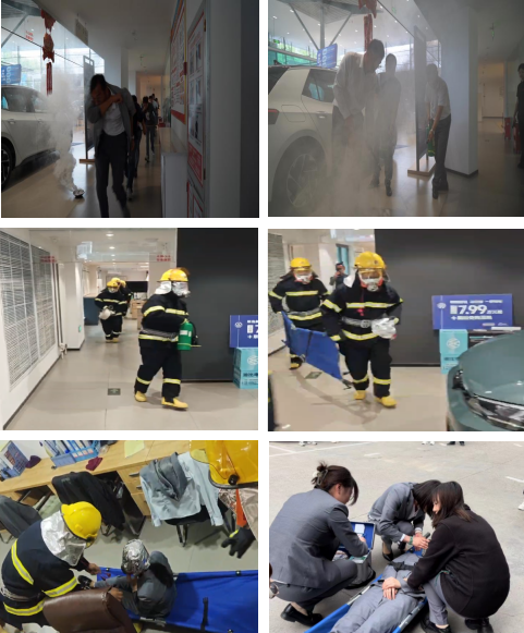 警報聲響起,模擬火災(zāi)場景迅速形成,展廳負(fù)責(zé)人發(fā)出緊急撤離提示后,迅速指揮職工用衣袖捂住口鼻,彎腰低姿有序撤離,模擬現(xiàn)場存在1名被困人員,搶險救援組更換裝備及取用應(yīng)急物資后趕往火情現(xiàn)場開展救援,隨著被困人員的救出,醫(yī)療救護(hù)組即刻對傷者進(jìn)行簡單救治,保障車輛對傷者進(jìn)行轉(zhuǎn)移救治。